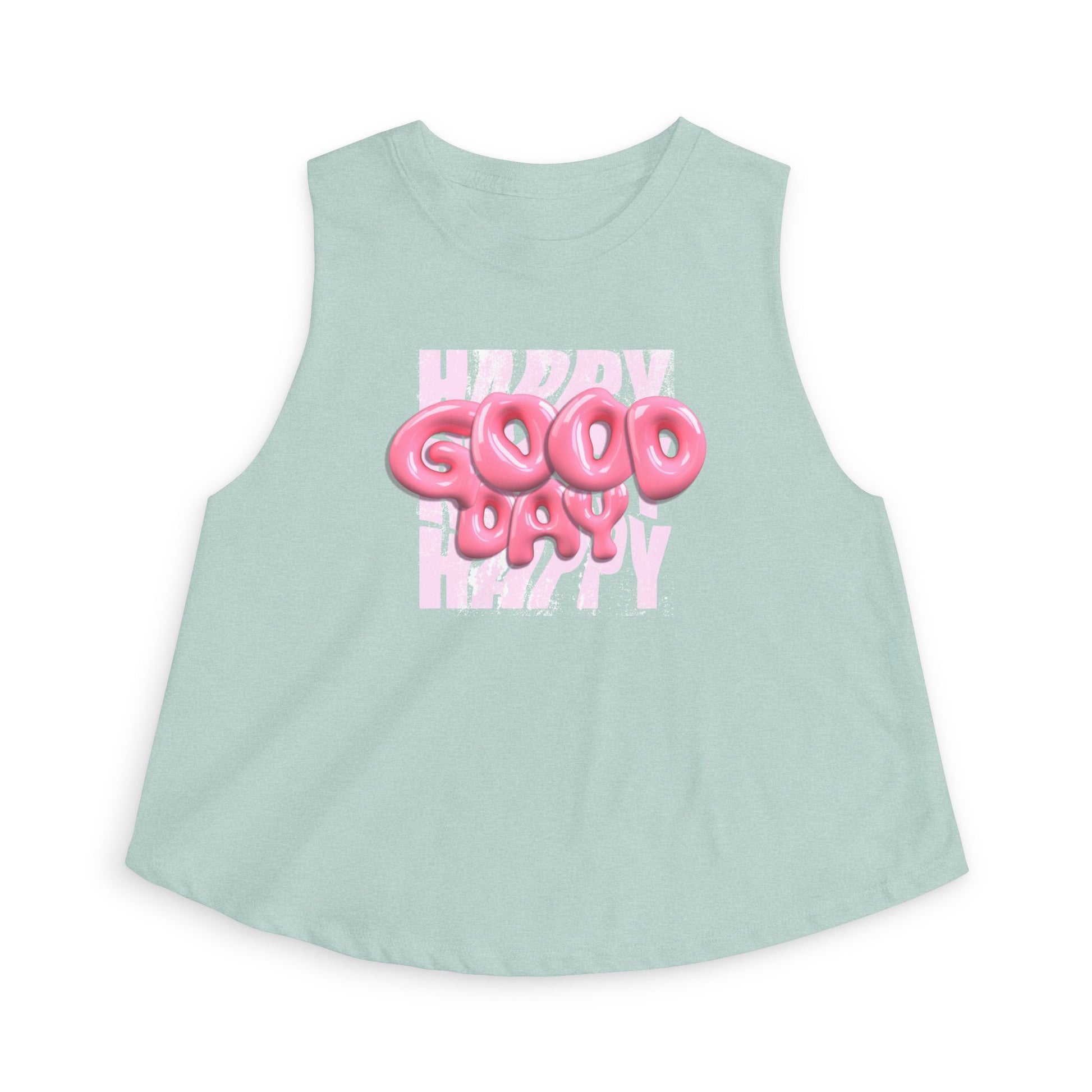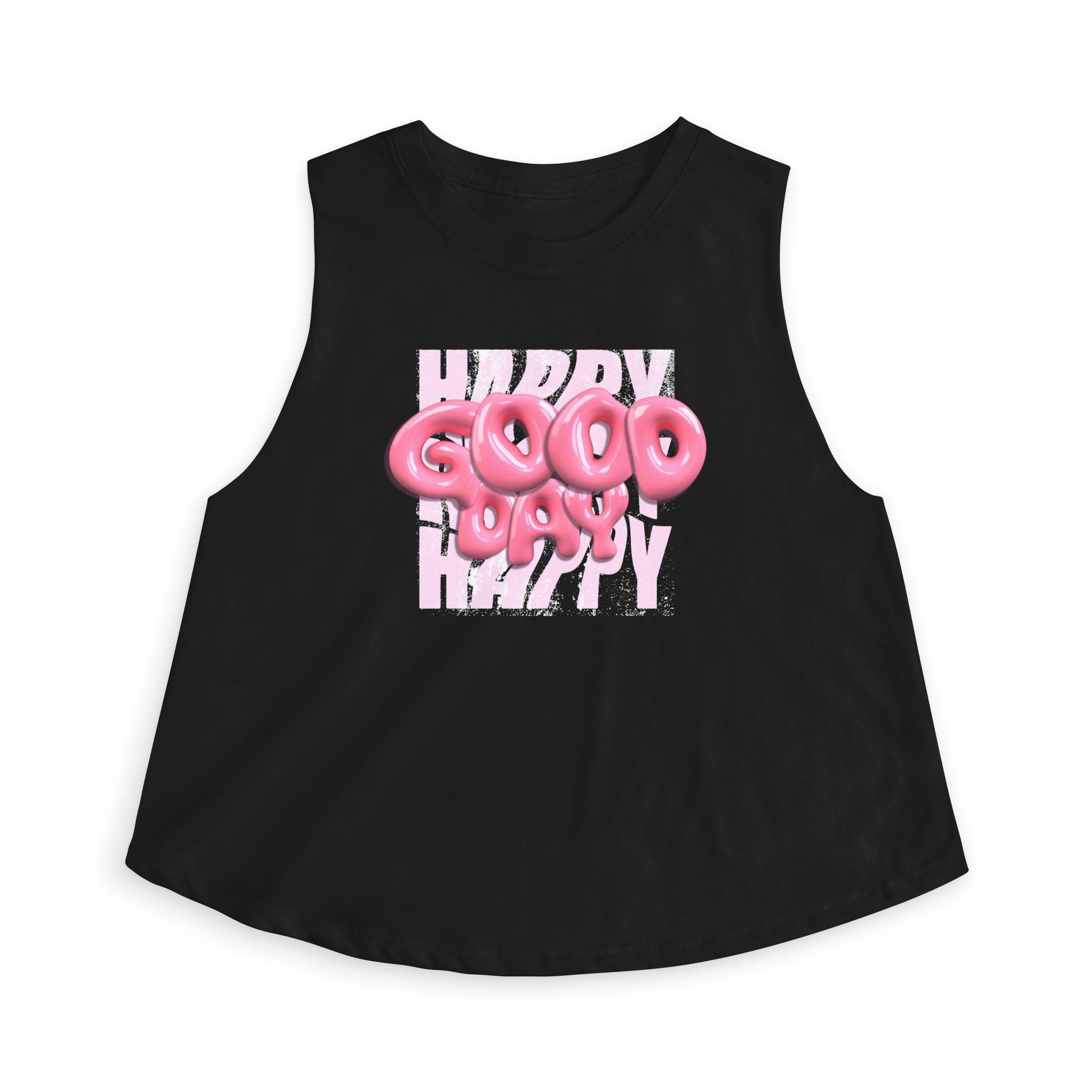 Happy Good Day Crop Top — Pink Balloon Text Graphic